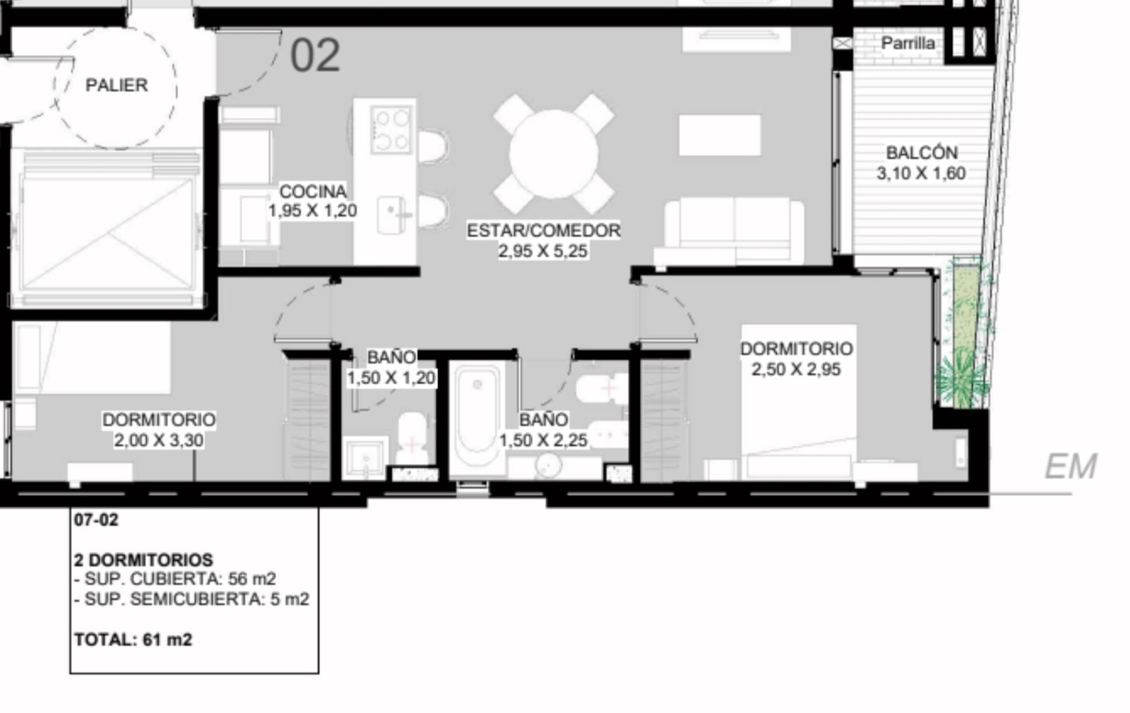 Departamento de 2 dormitorios de 61m2 totales. Cuenta con cocina integrada al estar comedor, 2 habitaciones con placares completos, 1 baño y 1 toilette. Balcón aterrazado con parrillero.