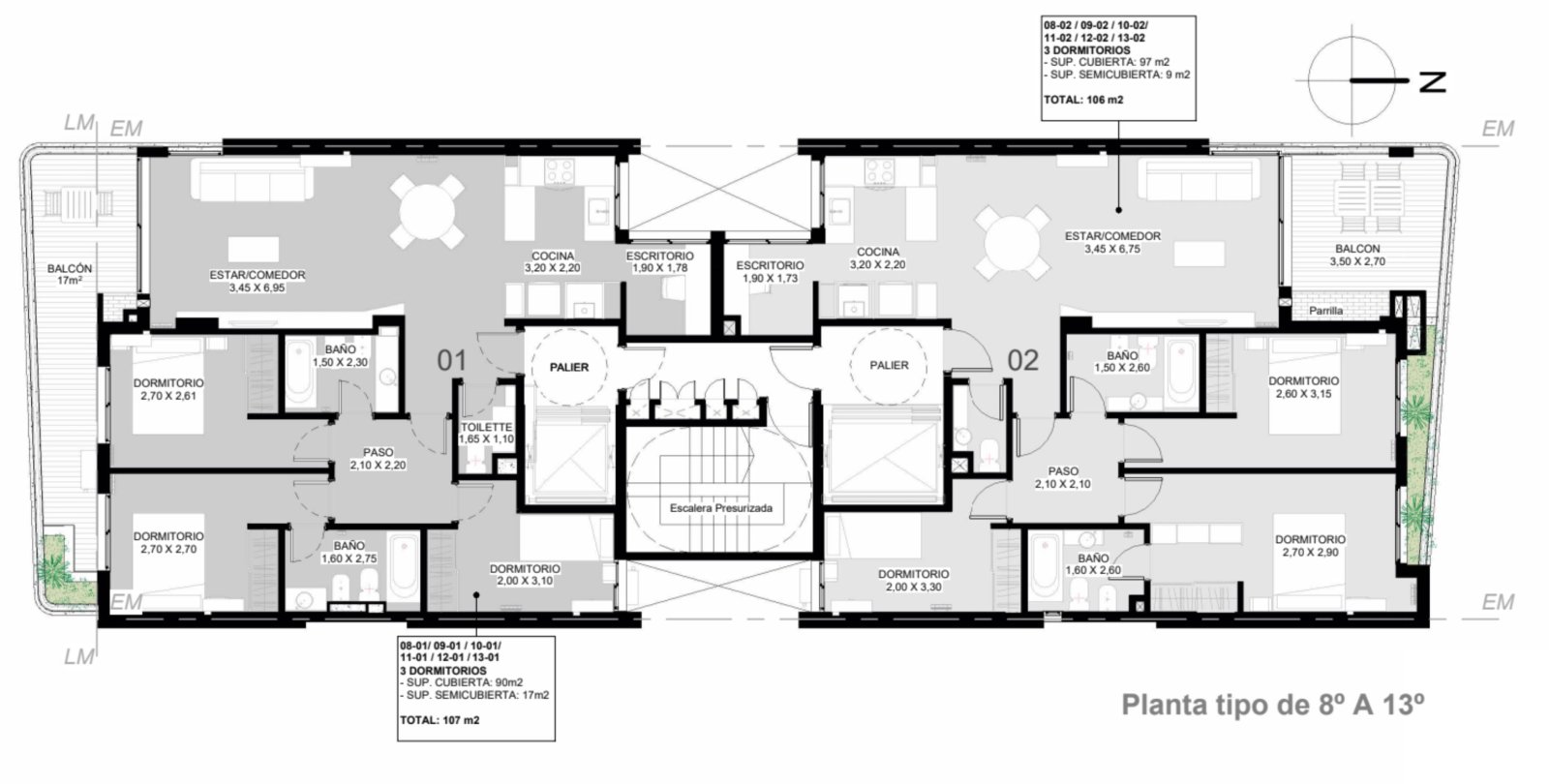 Departamento de 3 dormitorios de 106m2 totales. Cuenta con cocina en U semiseparada del estar comedor, escritorio, 3 habitaciones con placares completos, 2 baños y 1 toilette. Las unidades al frente cuentan con un amplísimo balcón corrido y la habitación principal con baño en suite. Las unidades al contrafrente tienen un balcón un poco más pequeñocon parrillero y la habitación principal con vestidor y baño en suite.