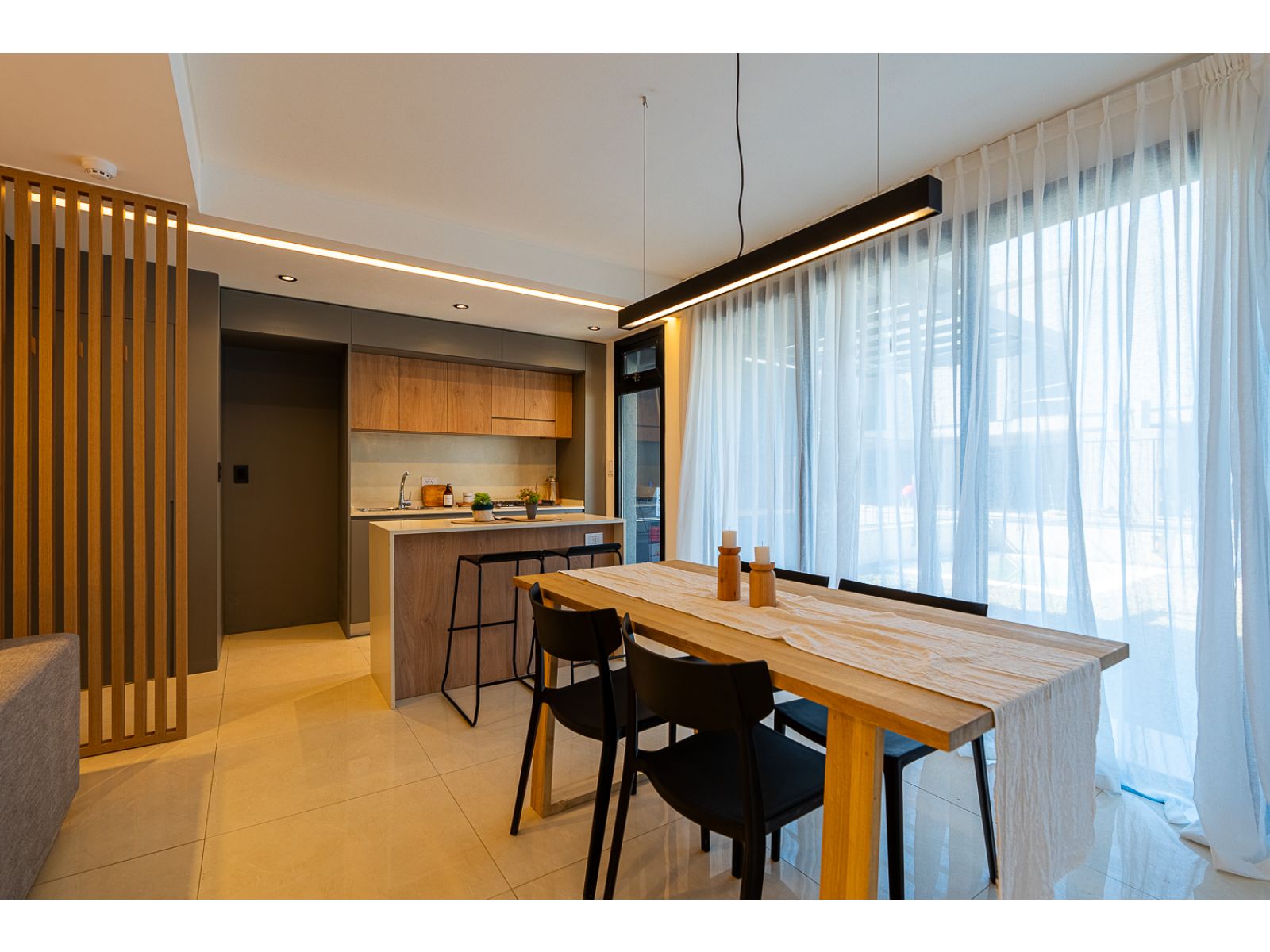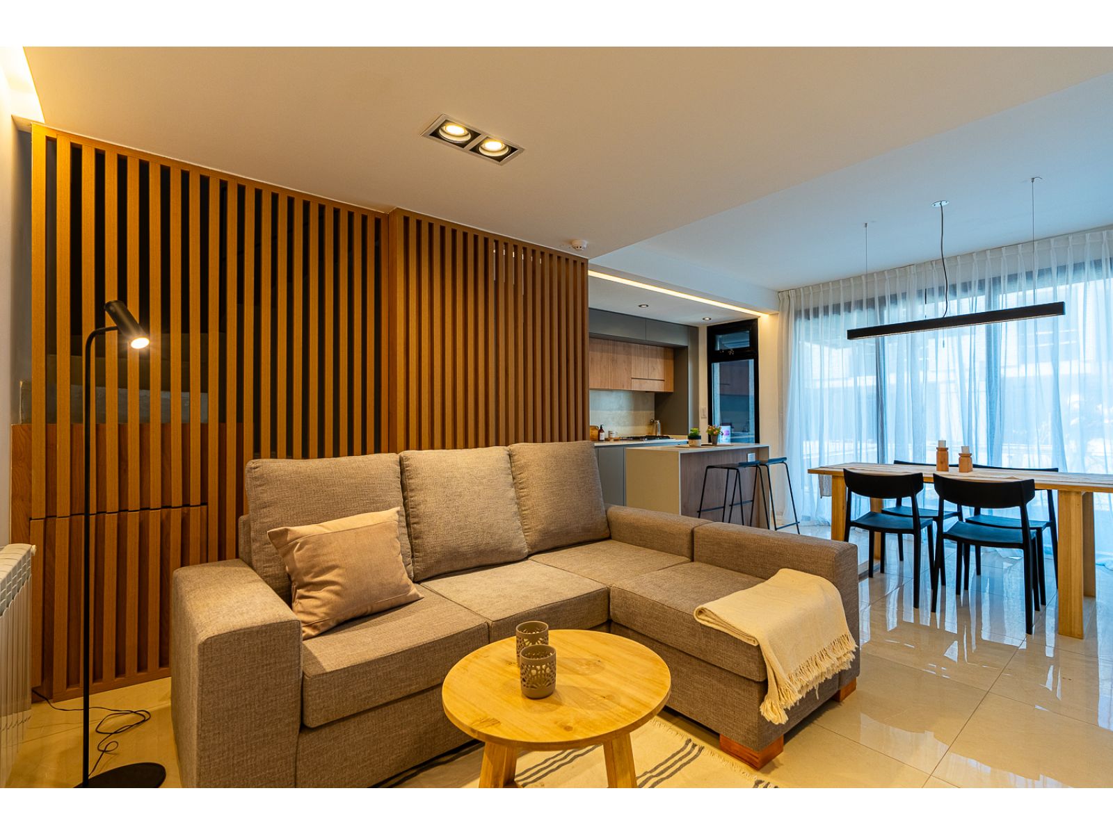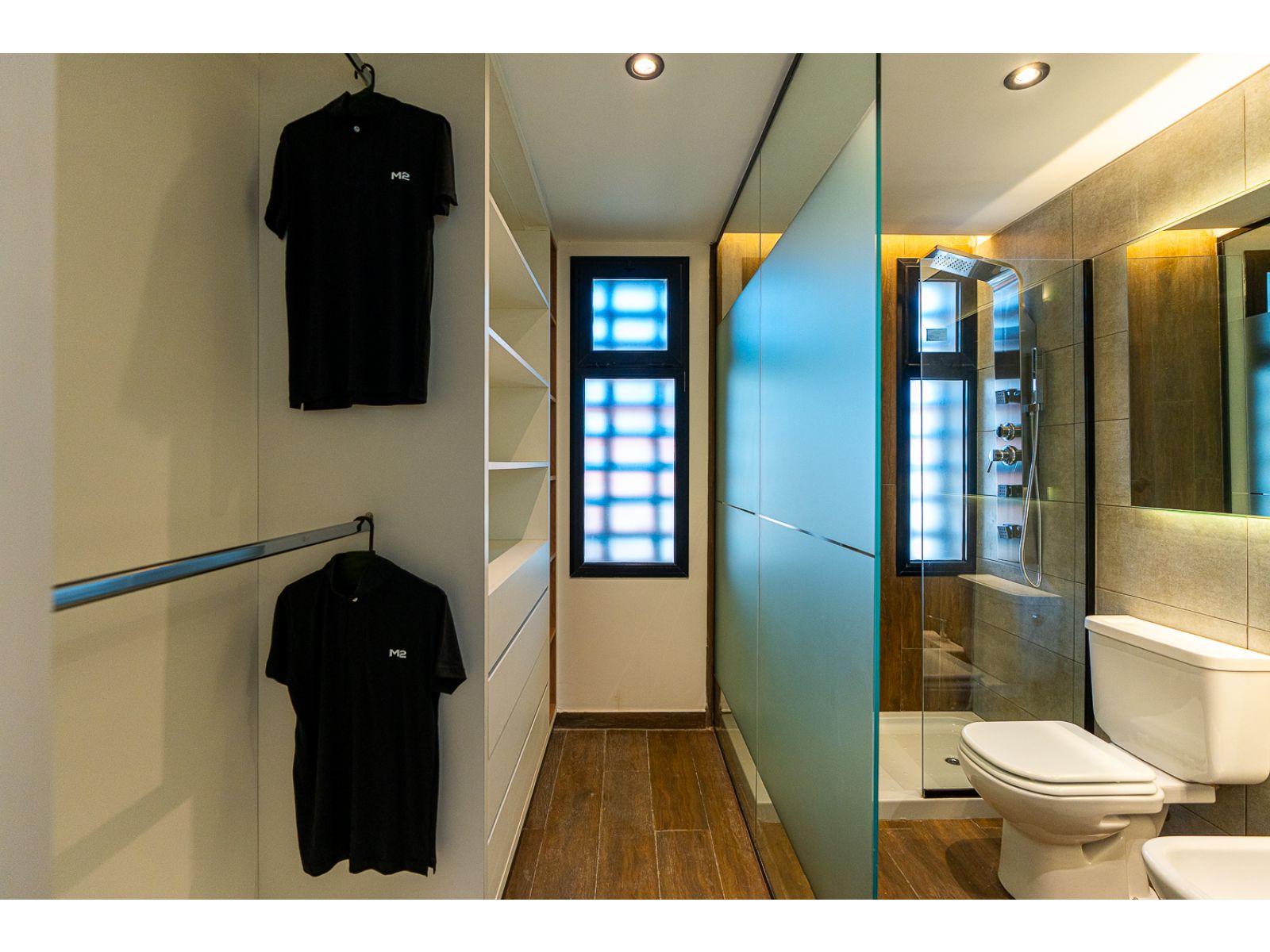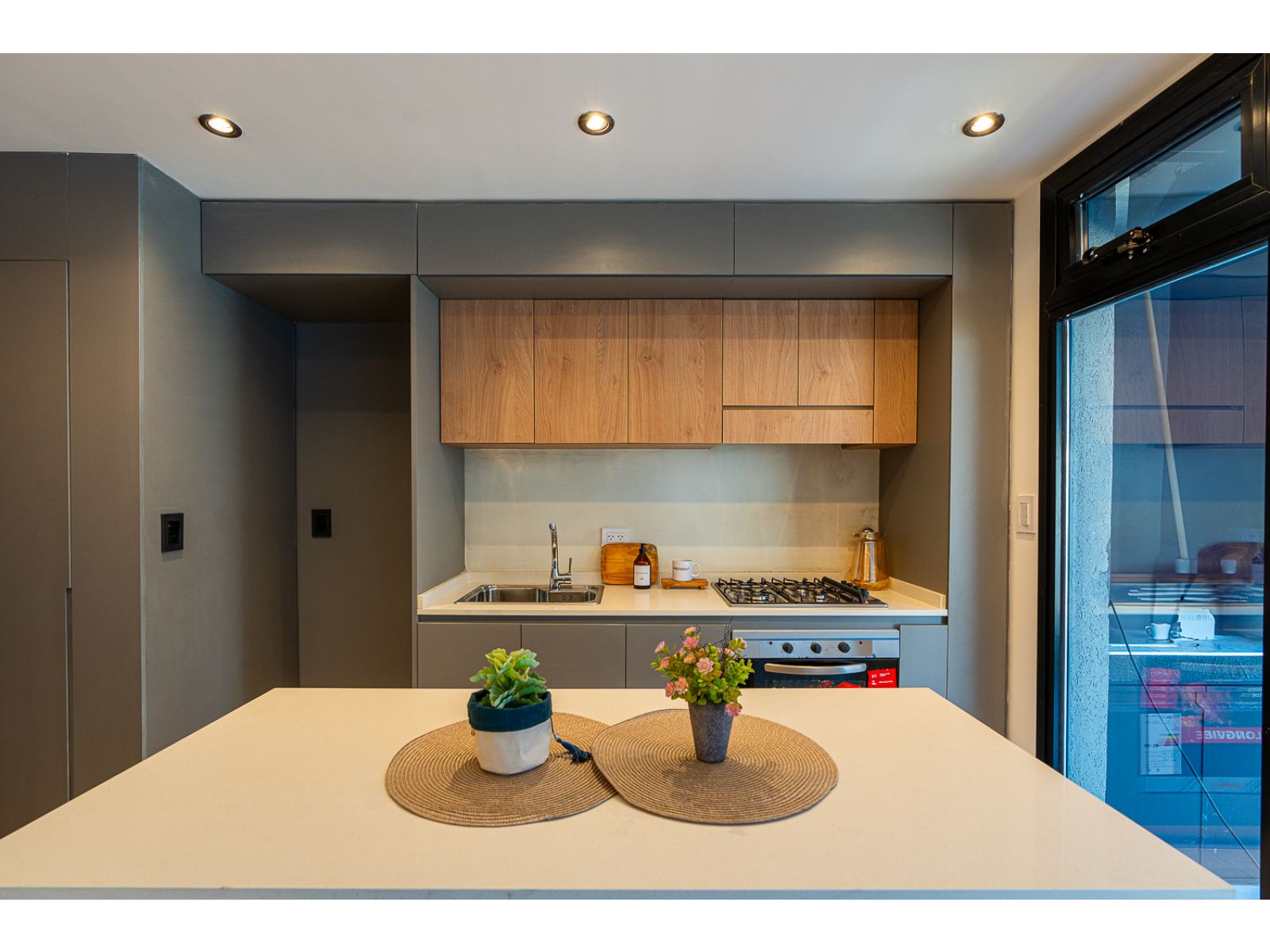 Circuito de seguridad perimetral con cámaras de vigilancia, control de seguridad en el ingreso, puertas de seguridad. Cerramientos de aluminio de alta prestación con DVH (doble vidriado hermético). Pisos y revestimientos de porcelanato. Sistema de caldera dual, para agua caliente y calefacción mediante radiadores, con termostato digital. Alacenas y bajo-mesadas de diseño en mdf laminado, zócalos de acero inoxidable. Bacha de acero inoxidable y griferías de diseño. Placares con frentes corredizos, equipados en sus interiores con divisiones, cajoneras y barral.