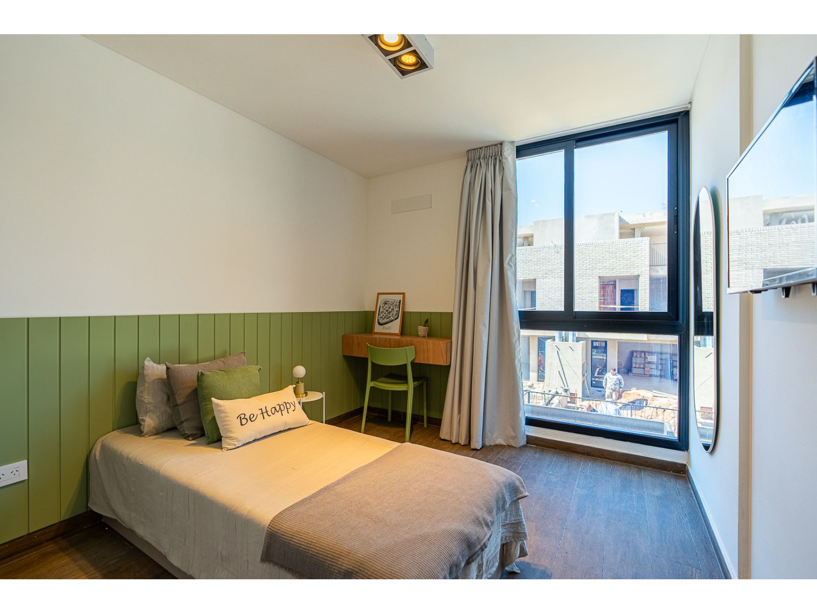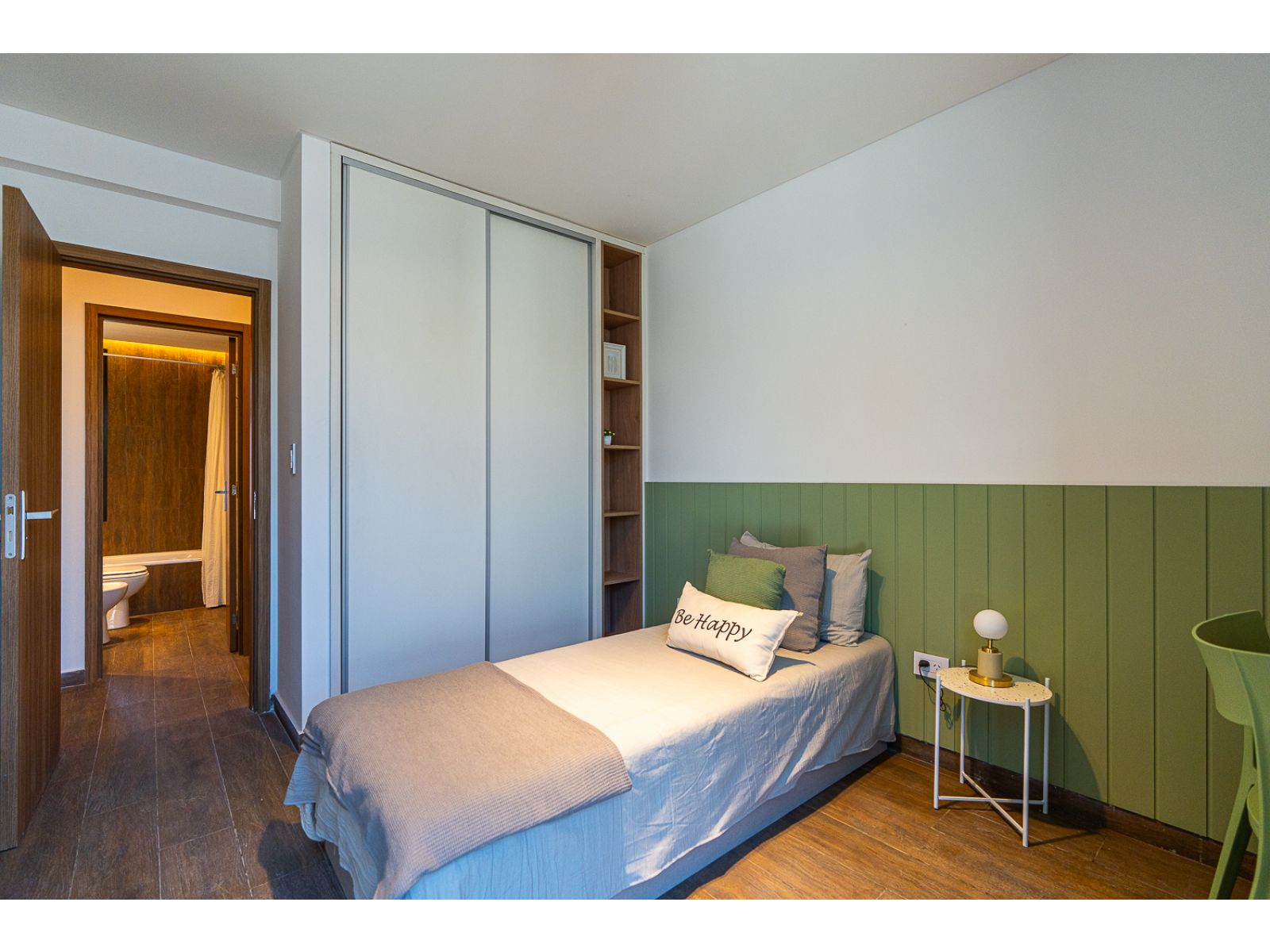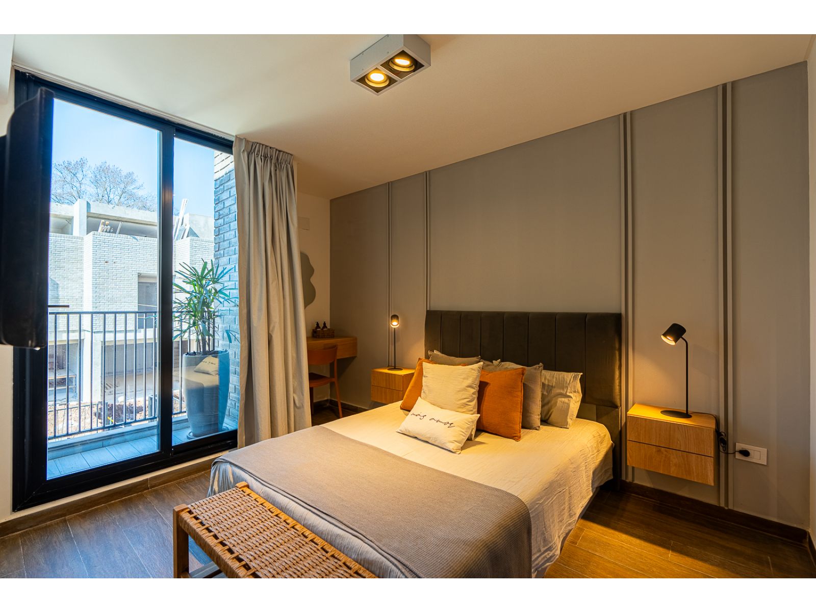 Las viviendas de 2 dormitorios cuentan con una superficie exclusiva de 100m2. Tienen acceso por escalera, cocina integrada al estar-comedor, toilette y balcón con vista a la Plaza Vicente Lopez y Planes. En planta alta cuenta con 2 habitaciones con placares y un baño completo. Por último cuenta con terraza de uso exclusivo.