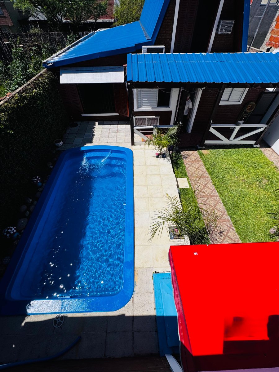 En el exterior, patio verde con piscina, solárium y quincho completo con asador, cocina equipada y baño de servicio.