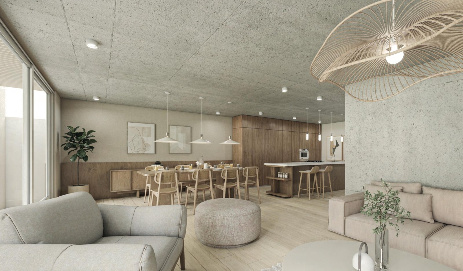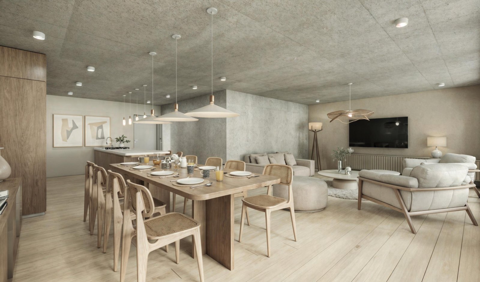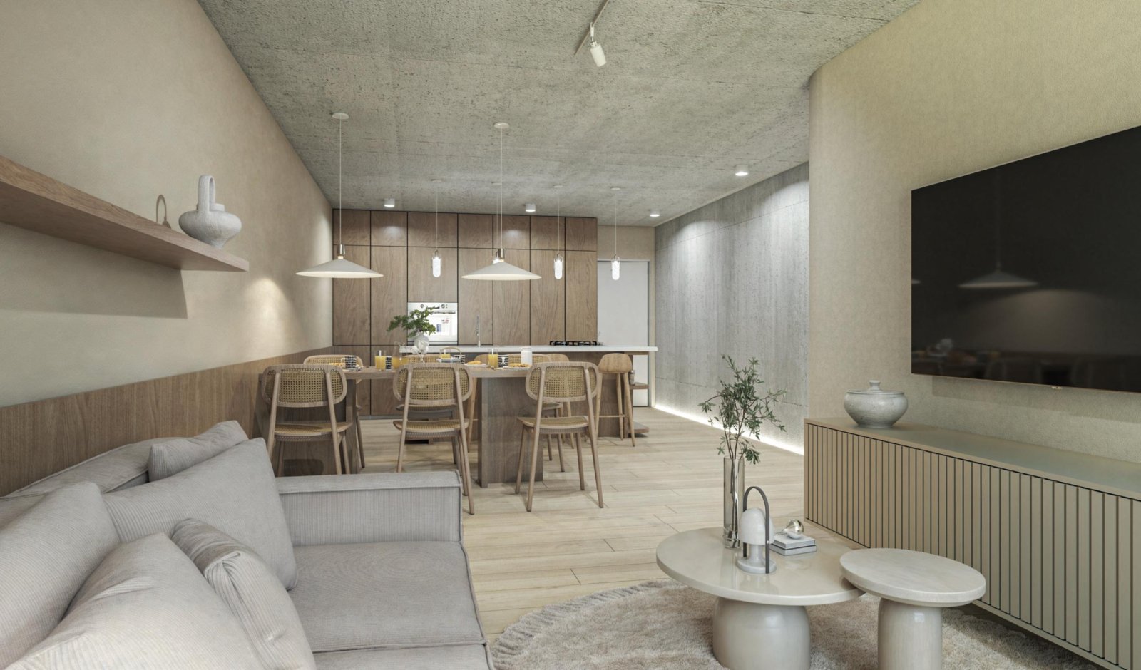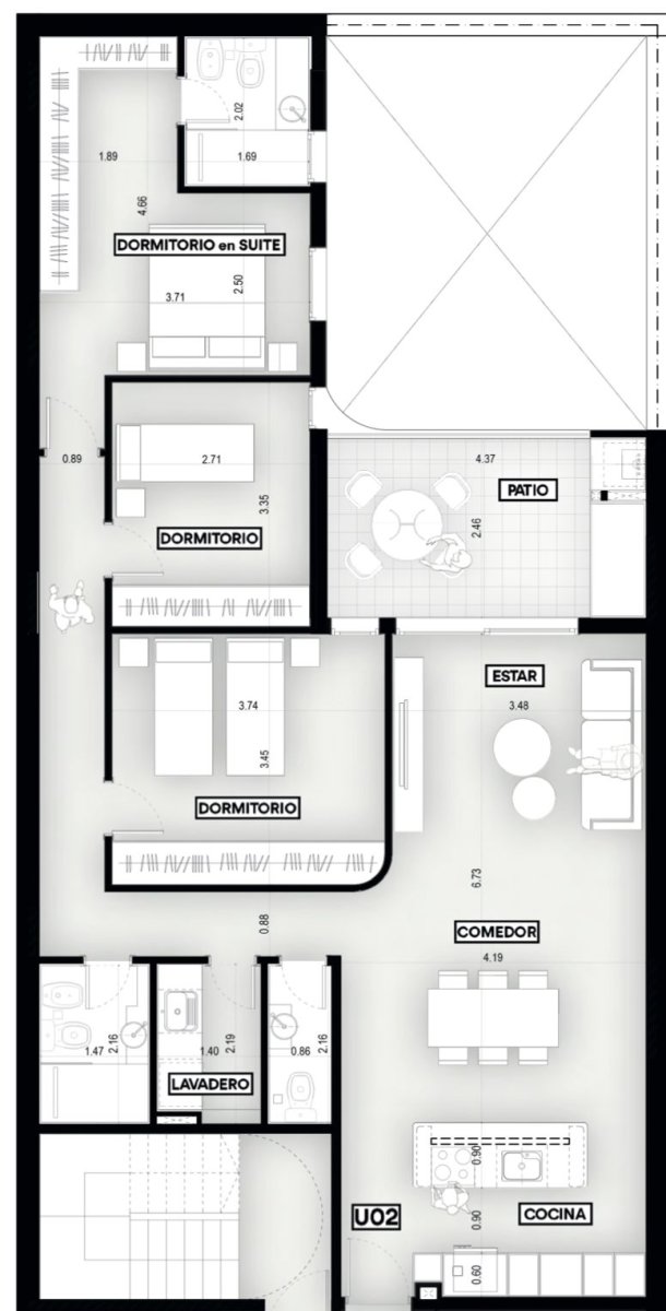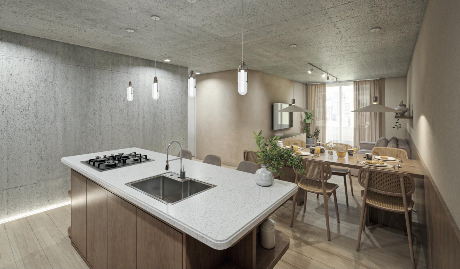 Los departamentos de 3 dormitorios se ubican al contrafrente del edificio, orientación norte. Las unidades disponen de cocina con isla integrada al estar-comedor, lavadero, toilette, baño completo y 3 habitaciones (la principal con el segundo baño en suite) 2 baños completos y 2 habitaciones (la principal con espacio para escritorio y baño en suite). El balcón es aterrazado con parillero propio.