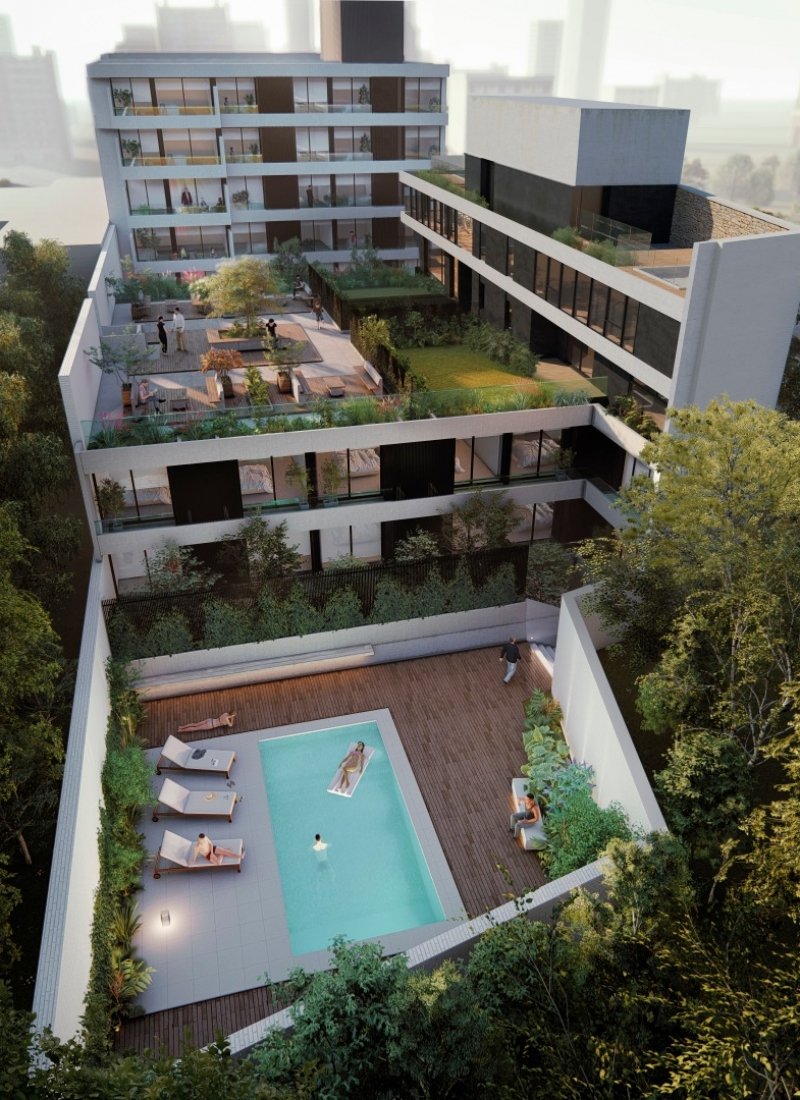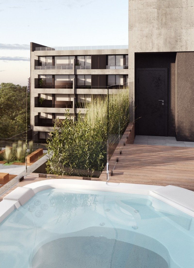 Amenities y Funcionalidad: El edificio no solo ofrece departamentos, sino un ecosistema de servicios. La azotea cuenta con un quincho totalmente equipado con parrillero, piscina con solarium, sauna, laundry, jacuzzi y gimnasio, ademas denáreas de estar al aire libre, ideales para el uso social. Además, el ingreso al edificio incorpora tecnología de seguridad con control de acceso electrónico y cámaras de vigilancia, sumado a sistemas de recolección de agua de lluvia para riego y mantenimiento de espacios comunes.