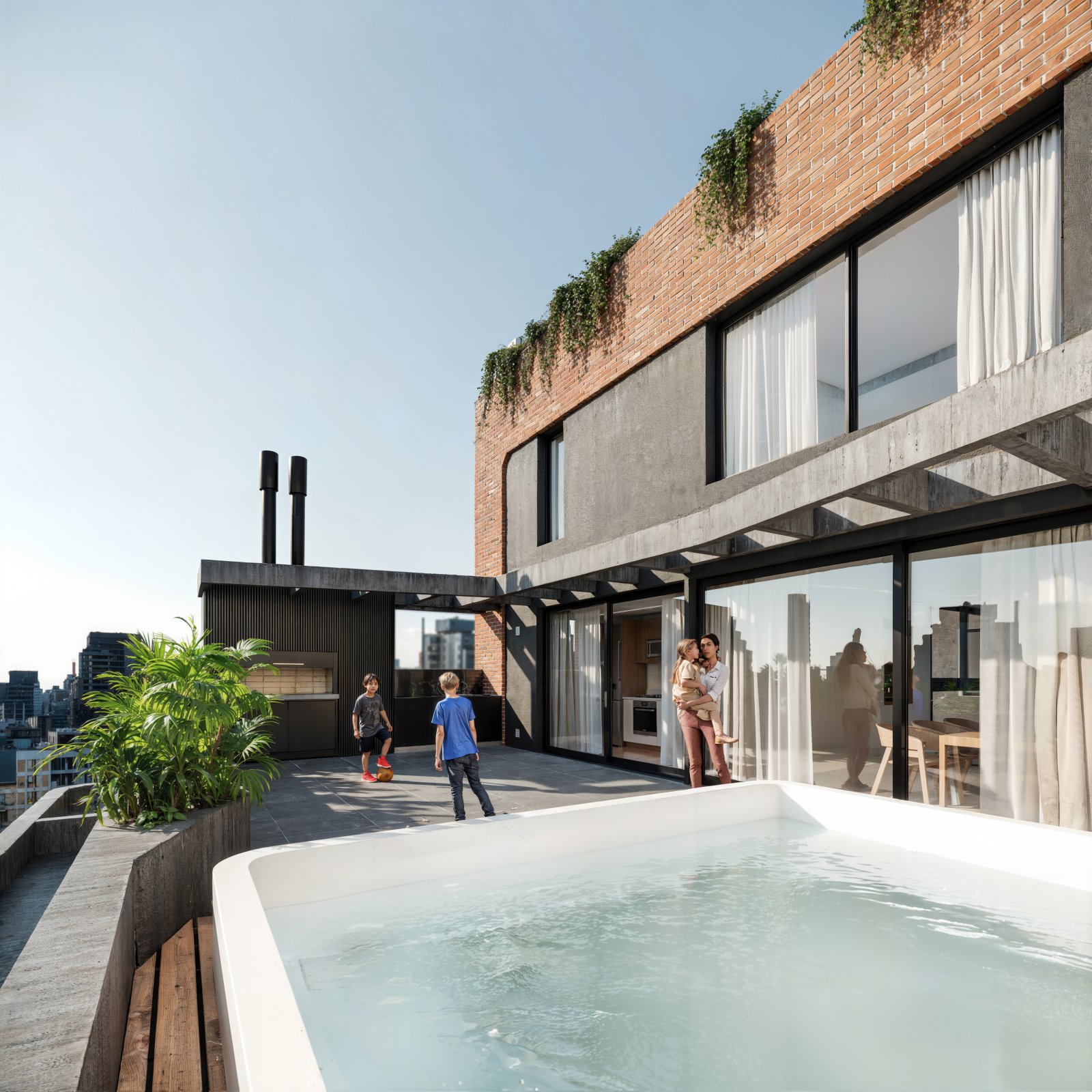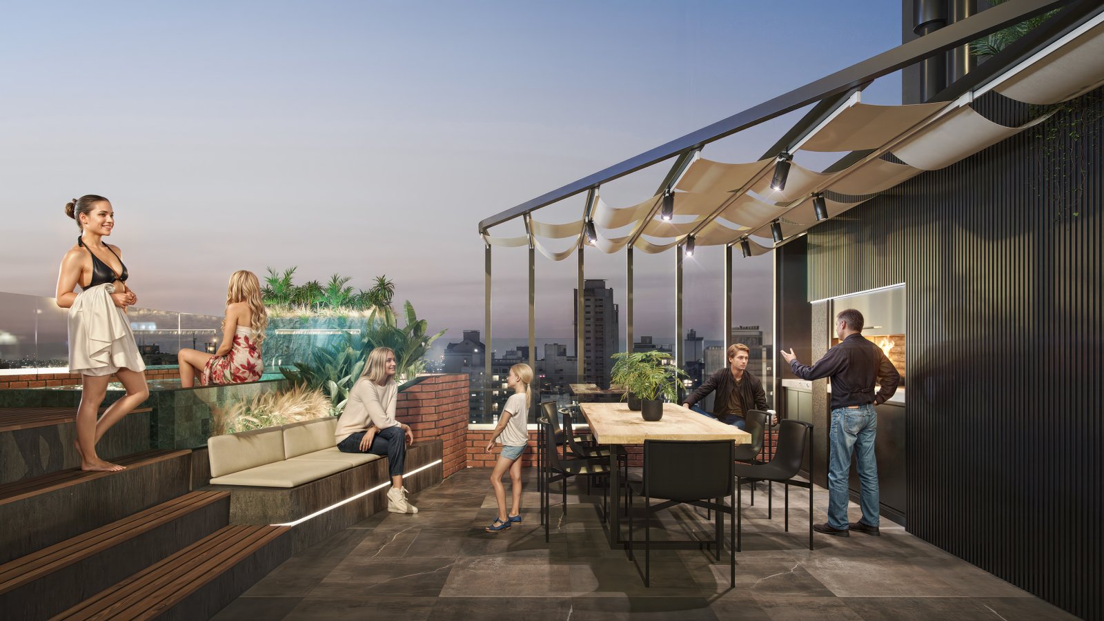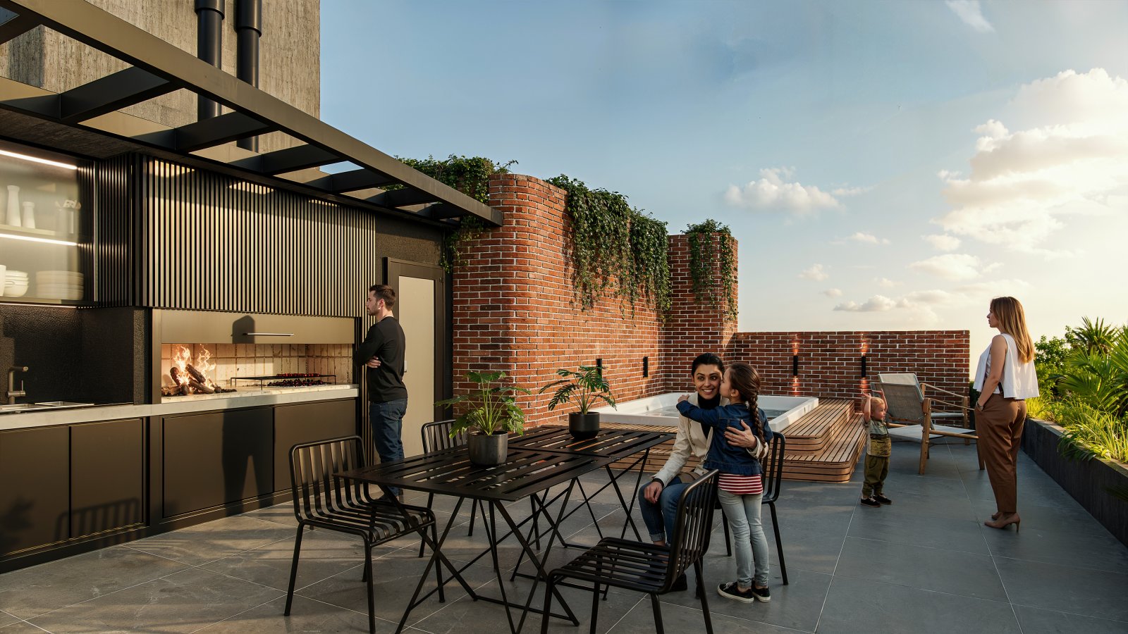 - Terraza de uso común equipada con amenities premium, que incluyen piscinas, quincho y gimnasio.