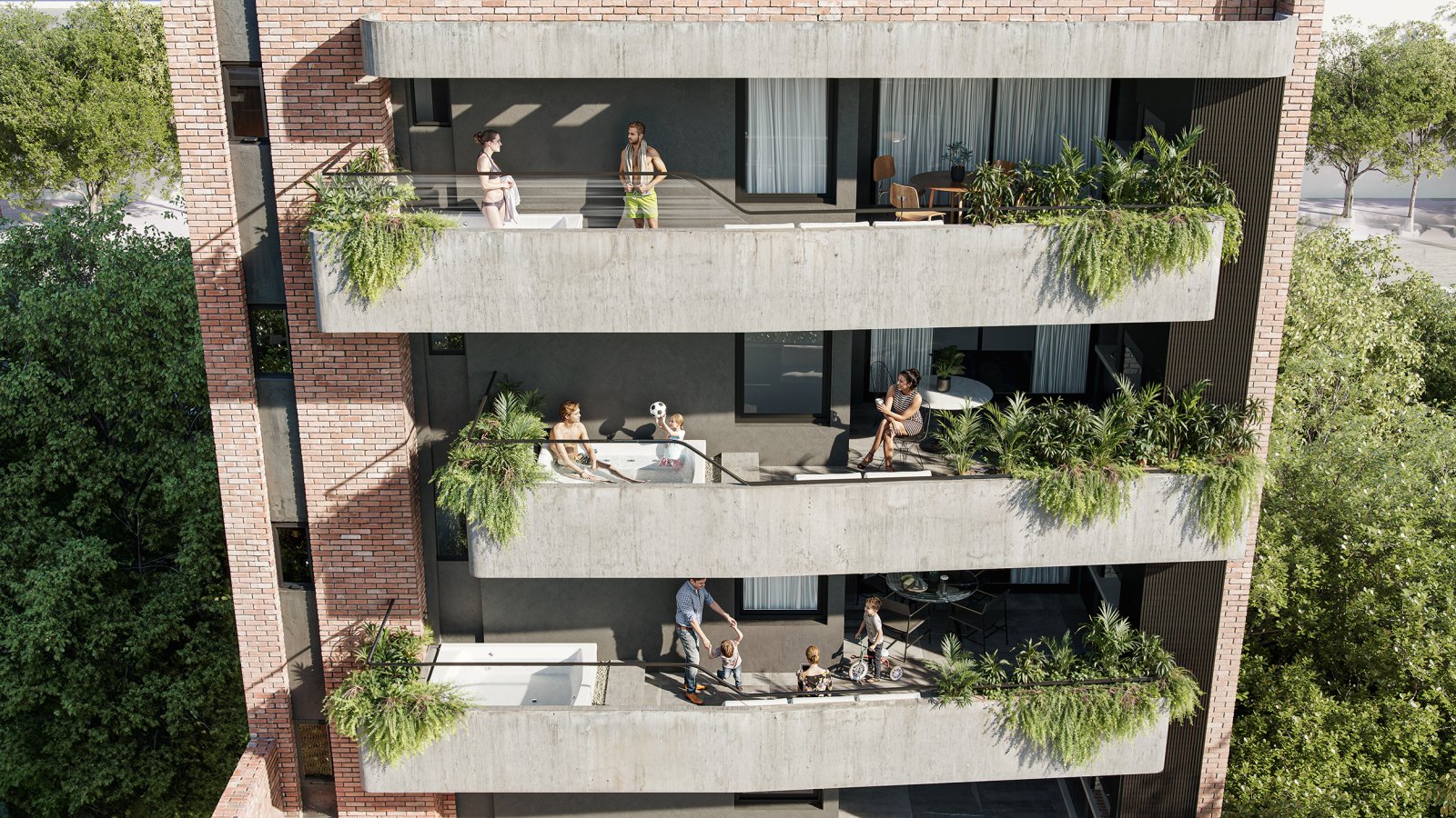 - Balcones aterrazados equipados con piscina y parrillero, con orientación Norte.