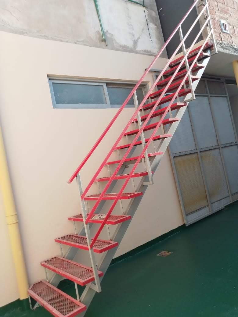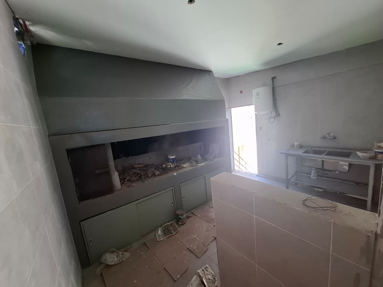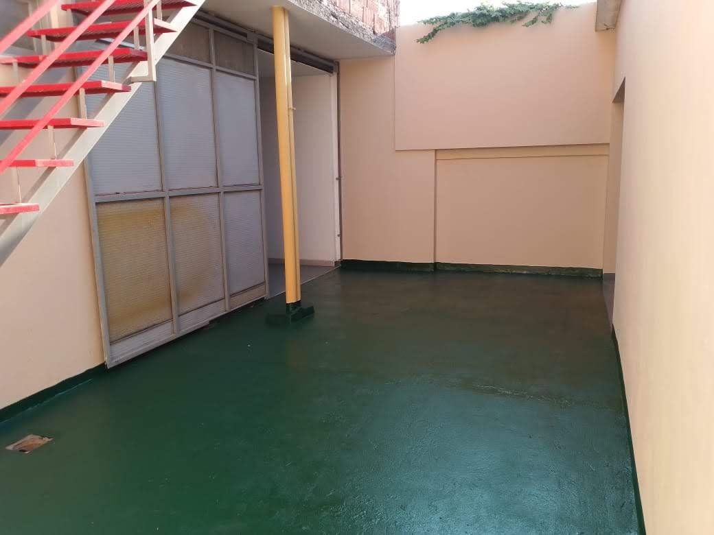 Hacia el fondo, la propiedad ofrece un sector cubierto con cocina y parrillero, concebido como espacio de apoyo o área social, desde donde se accede a la escalera de emergencia que conecta con la planta superior.